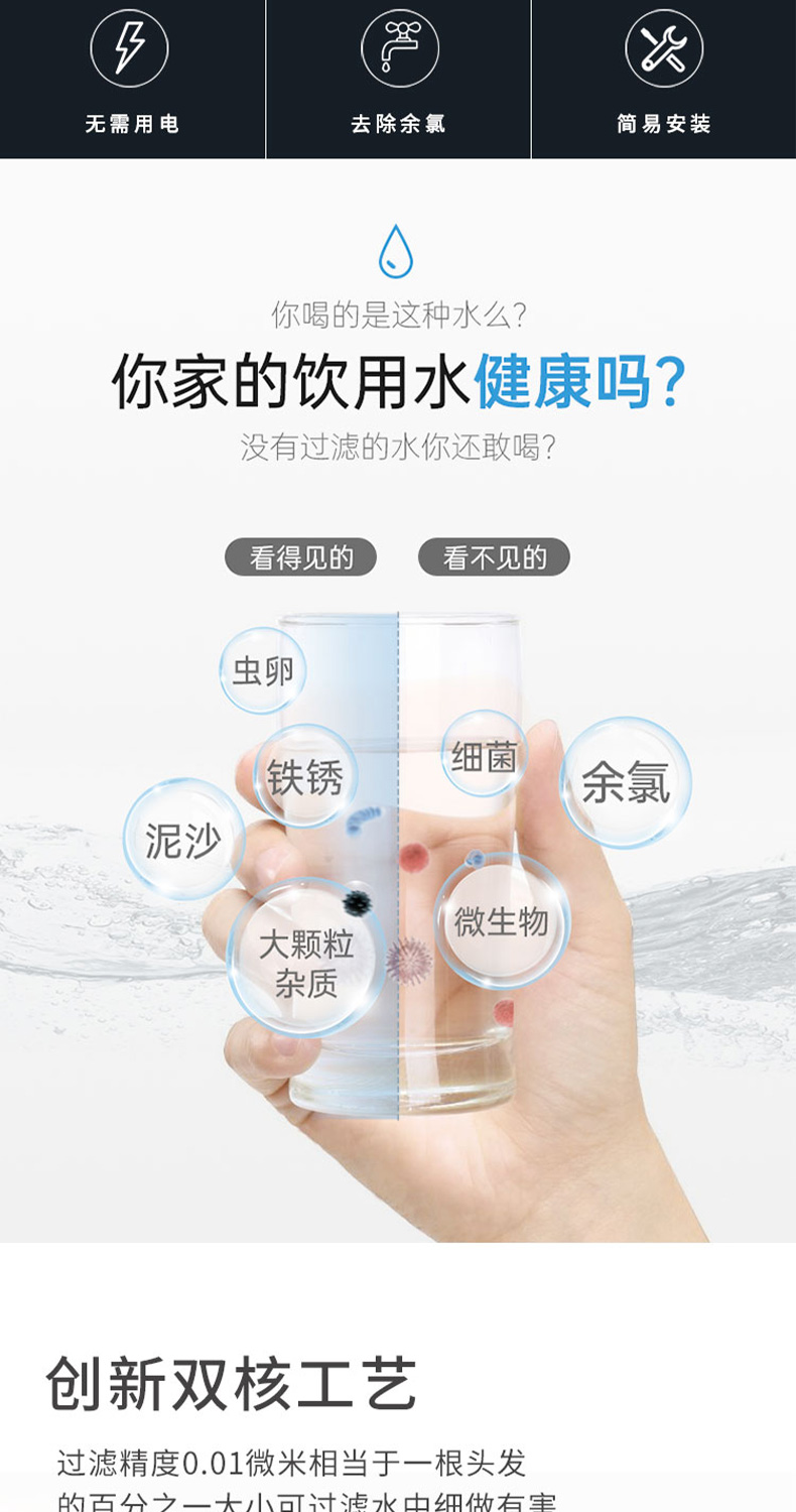 ◆ 凈水過程0廢水不用電,即使是櫥下無電源也能用,隨時喝到健康水。