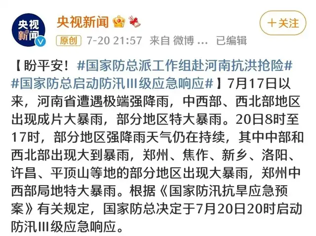 7月20日22時(shí)國(guó)家防總對(duì)河南啟動(dòng)防汛Ⅲ級(jí)應(yīng)急響應(yīng),并派出工作組協(xié)助開展抗洪搶險(xiǎn)。