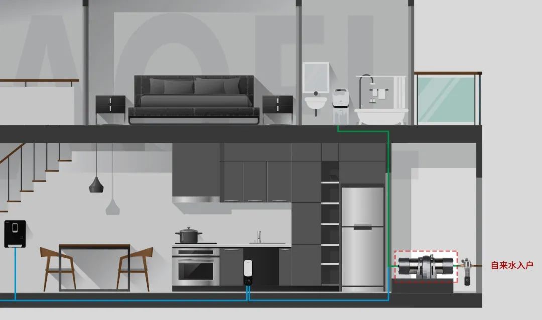 前置過濾器+中央凈水機+軟水機+末端凈水器+速熱管線機